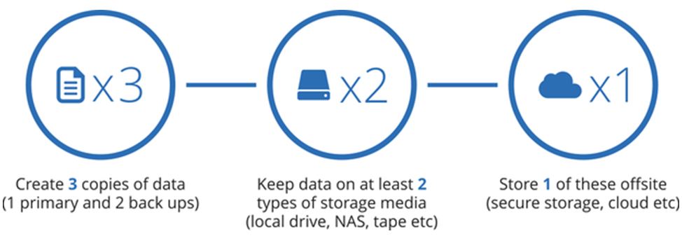 The industry standard for backups is founded on the 3-2-1 rule. It states that there should be three copies of the data, stored on two types of media, with one copy kept off-site.